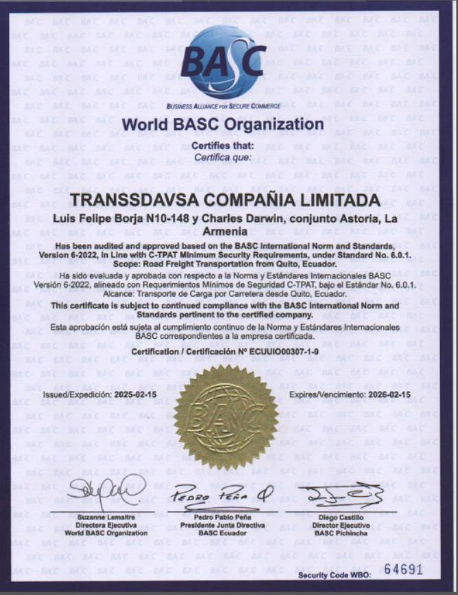 TRANSSDAVSA COMPAÑÍA LIMITADA., está dedicada a la prestación de servicios de transporte de carga por carretera, opera con jurisdicción nacional, el futuro que avecina nos marca un enorme compromiso de garantizar la satisfacción de las necesidades y expectativas de las partes interesadas, en base a los objetivos planteados en el sistema de gestión en control y seguridad BASC.